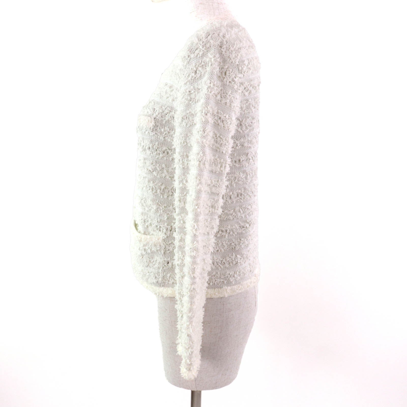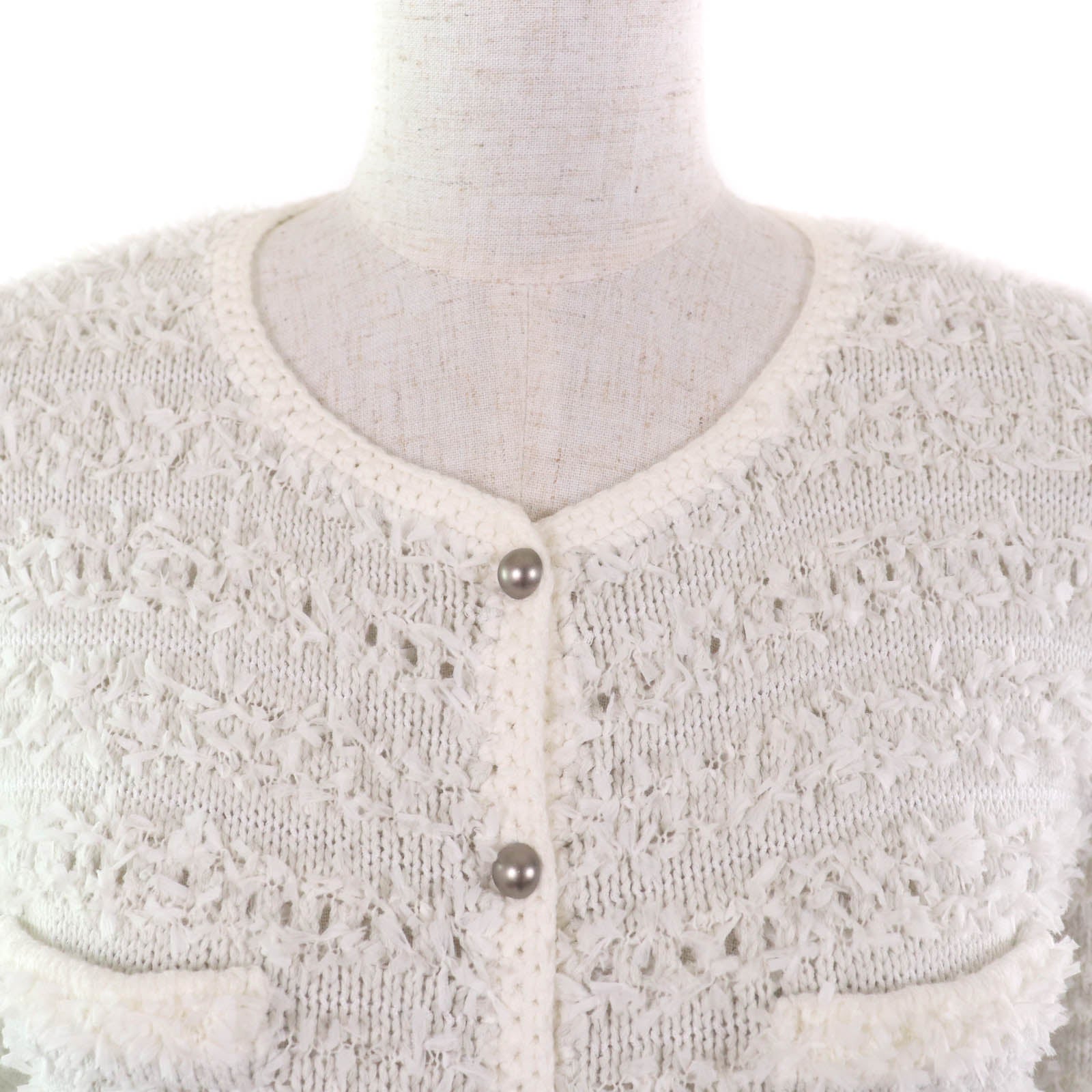 Wrap yourself in effortless elegance with the FOXEY Ribbon Tweed Cotton Cardigan. This beautifully crafted piece embodies a blend of practicality and luxurious style. The delicate ribbon detailing adds a touch of feminine charm to the classic tweed texture, making it a versatile addition to your wardrobe. Perfect for layering, this cardigan effortlessly elevates any outfit, providing both comfort and sophistication. Whether you're running errands or attending a social gathering, this cardigan is designed to complement your lifestyle with its understated yet refined aesthetic. Experience the perfect harmony of practicality and chic design with this FOXEY masterpiece.