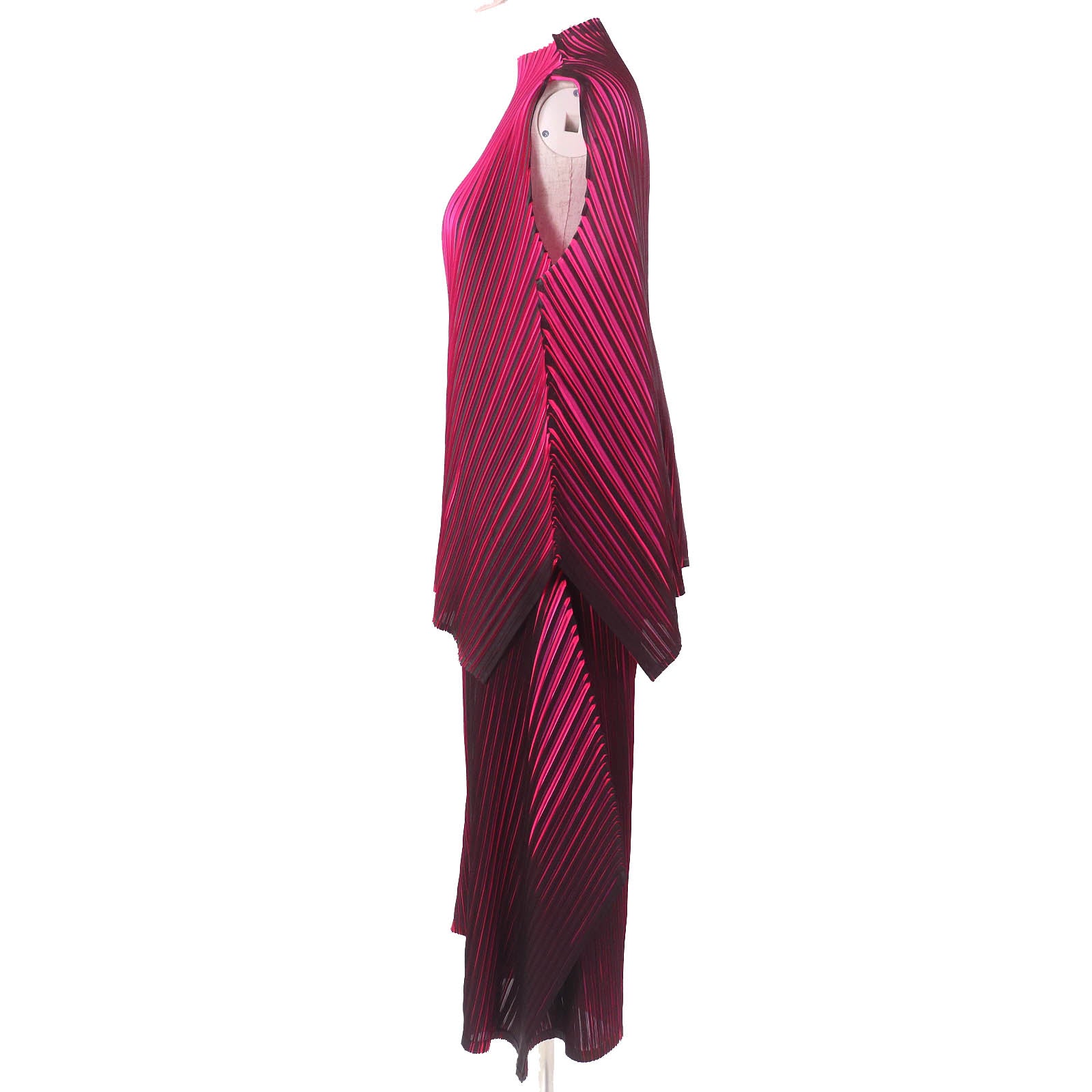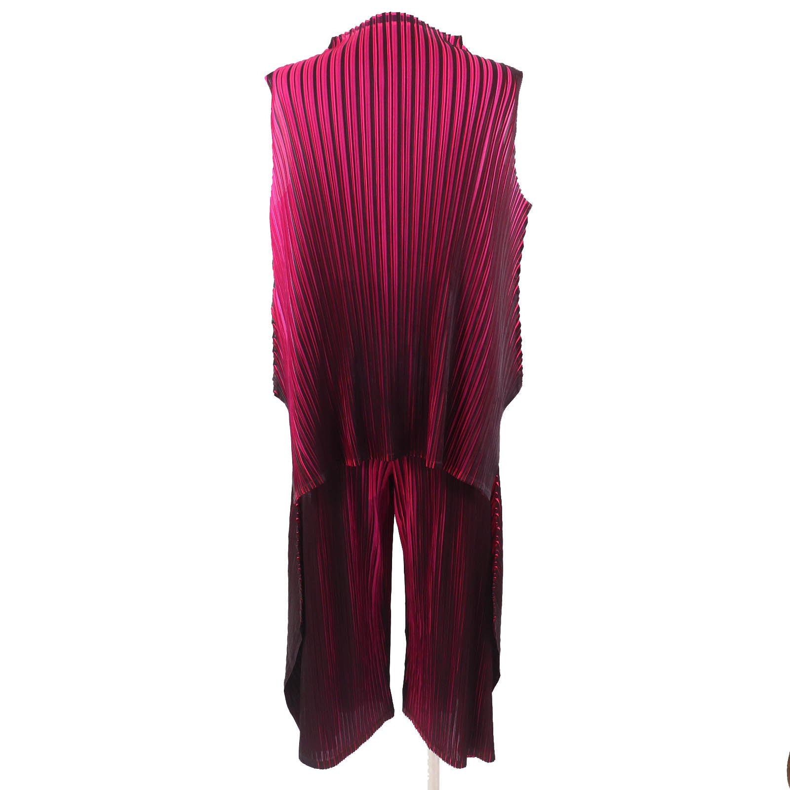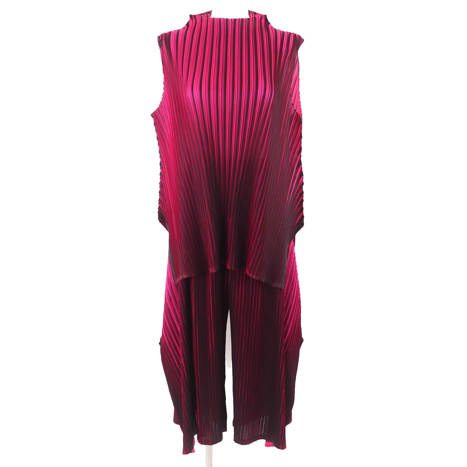 Elevate your everyday style with this sophisticated PLEATS PLEASE set. The high neck sleeveless T-shirt and wide pants offer a modern, flowing silhouette that’s both comfortable and undeniably chic. Crafted from signature pleated polyester, this set drapes beautifully and moves with you. Effortlessly transition from a day of errands to an evening out with this versatile ensemble. It's a statement piece that embodies practical luxury and lifestyle-focused design. A perfect blend of elegance and ease.