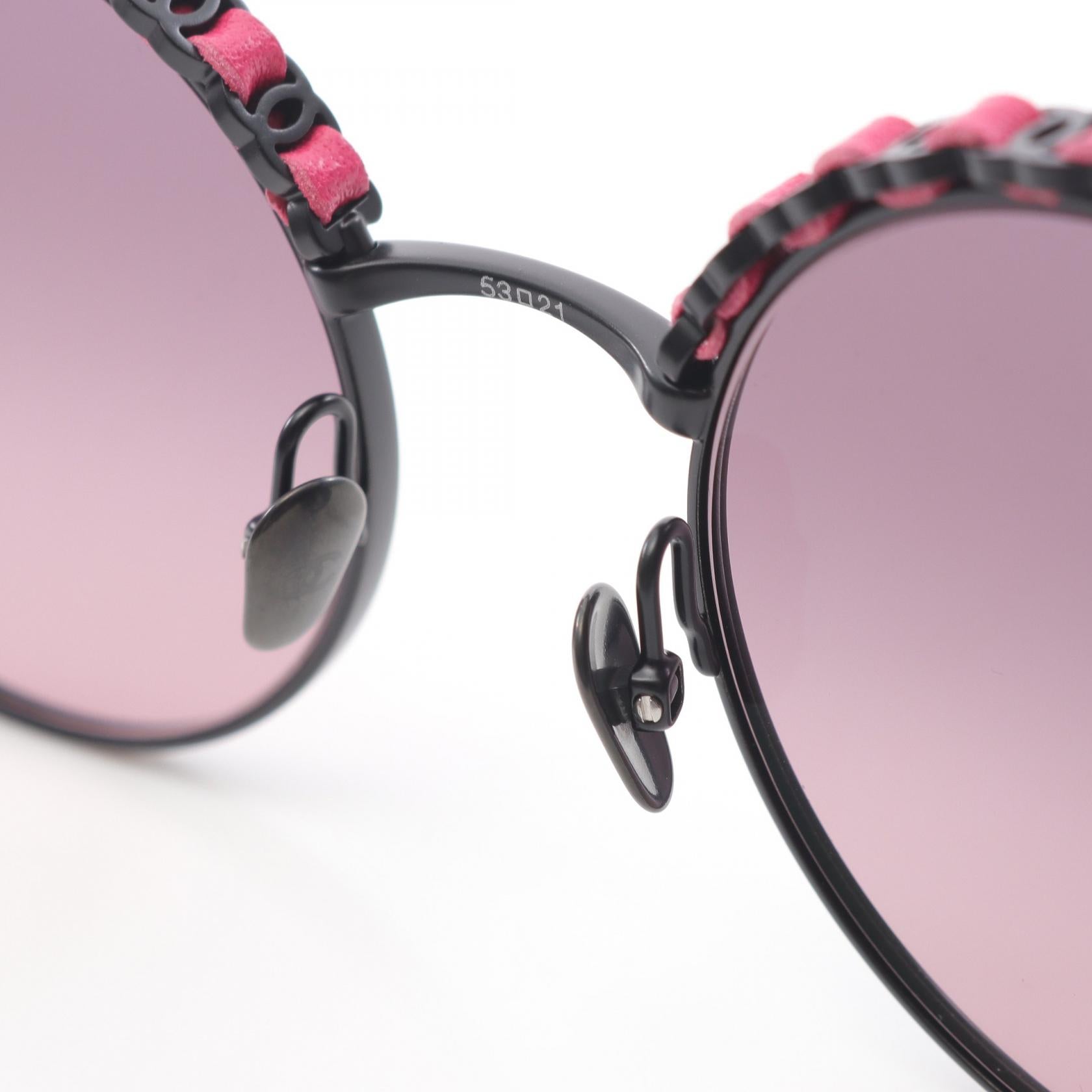 Indulge in timeless elegance with these Chanel Coco Mark sunglasses. Crafted with luxurious leather and metal accents, they effortlessly blend sophistication with everyday practicality. A chic and versatile accessory, these sunglasses will elevate your style and protect your eyes with a touch of iconic Chanel allure. Perfect for the discerning woman who appreciates quality and lasting style.