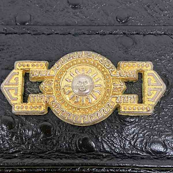 Indulge in the luxury of the Versace Sunburst Ostrich Card Case. Crafted for the discerning woman, this exquisite accessory combines practicality with timeless elegance. The rich ostrich leather and iconic sunburst design exude sophistication, making it a perfect addition to your everyday lifestyle. Organize your essentials in style and make a statement of refined taste.